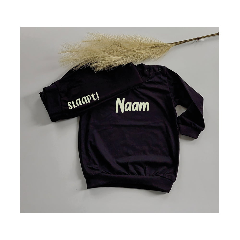 Deze superlieve kinder pyjama’s met naam worden voorzien van de naam op het shirtje en op de broek de tekst slaapt. De pyjama’s hebben een goede pasvorm en vallen normaal, niet te klein of te groot.