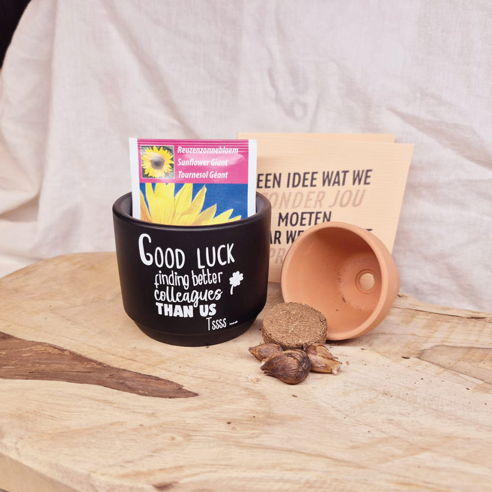Cadeau afscheid collega ‘Good Luck’ is één van onze gave producten om jouw lieve collega iets mee te geven als aandenken van jullie of jou als collega’s. Natuurlijk gaat hij of zij nooit meer van die geweldige collega’s zoals jullie vinden! Het cadeau afscheid collega ‘Good Luck” bestaat uit een bloempotje met de tekst:’Good luck finding better colleagues than us’ met een aantal bloembolletjes van klavertjes vier. Naast de klavertjes vier doen we er ook een zakje zonnebloementjes bij om de zon een beetje te laten schijnen naast het geluk!