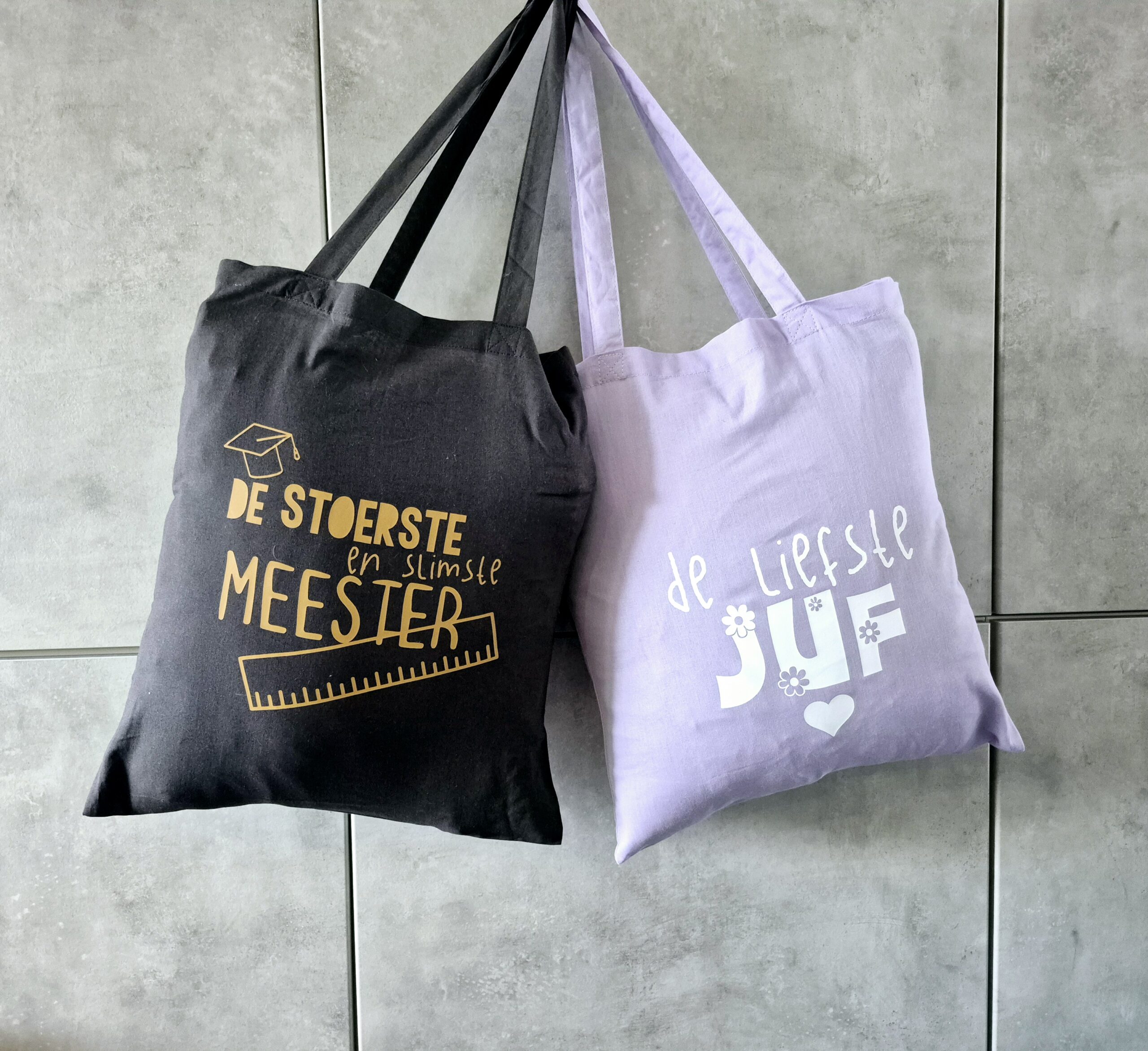 Tas bedrukken lieve juf | De tassen hebben een lila kleur met witte opdruk voor de lieve juf. Heb je liever een andere kleur dan kan je dat altijd even laten weten.
