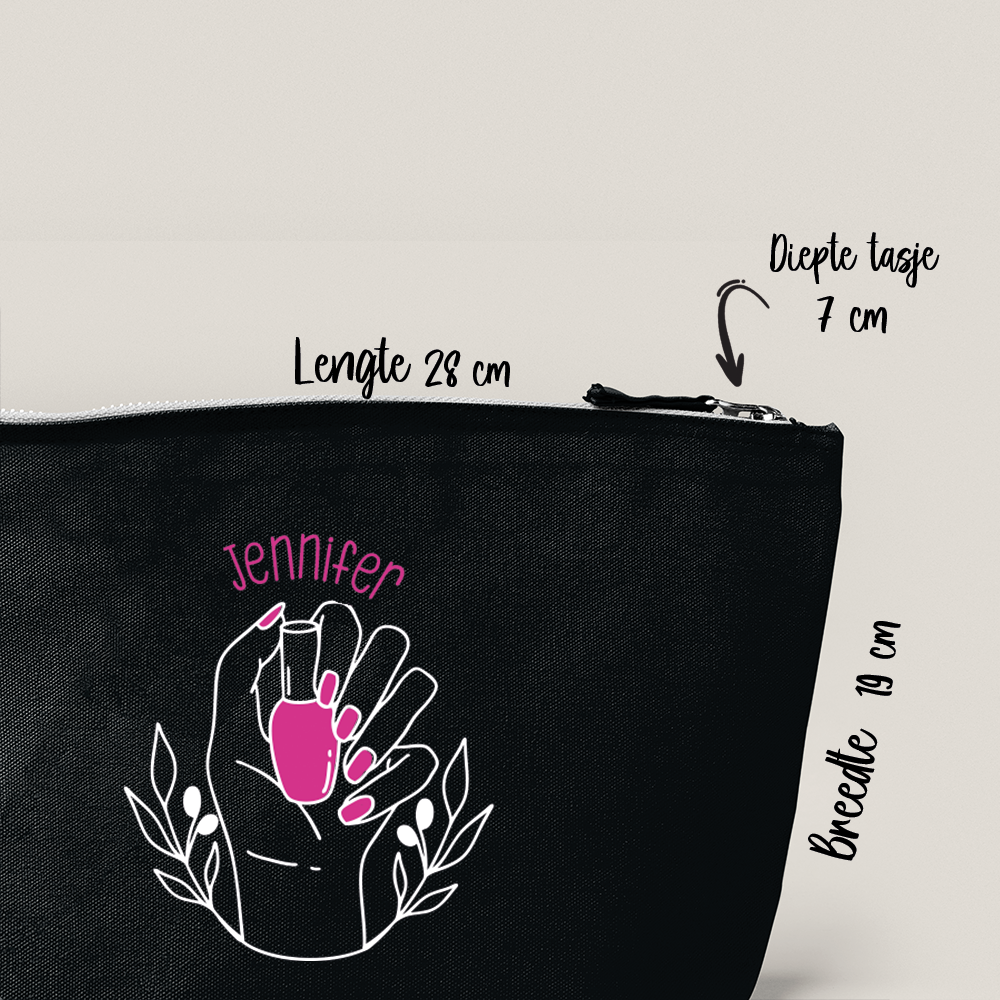 Cadeau tasje nagels met naam is een superleuk cadeau voor iemand die altijd heerlijk bezig is met haar nagels, make up en uiterlijk. Of je nu jong of oud bent, deze tasjes zijn altijd leuk om te krijgen. Natuurlijk zijn deze cadeau tasjes ook een leuk cadeau voor jezelf. De cadeau tasjes met naam hebben een afmeting van 28 cm breed, 19 cm hoog en 7 cm diep. Genoeg ruimte voor al jouw make up en nagellakjes.