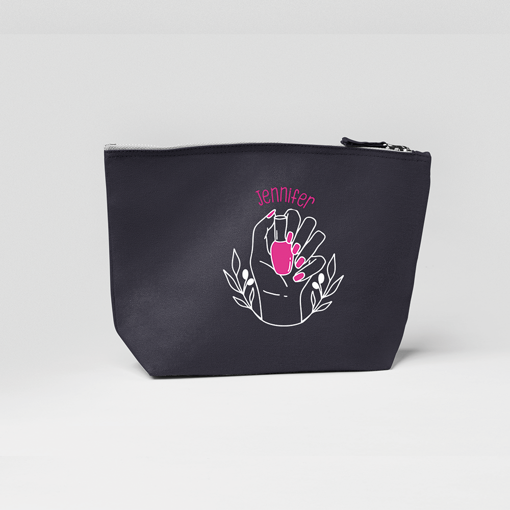 Dit cadeau tasje voor elke dame is gemaakt van 100% Brushed Cotton Canvas en is voorzien van een vintage style metal ritssluiting. Standaard bedrukken wij het tasje met een witte en pink kleur opdruk. Deze opdruk bestaat uit een nagel en hand design en de gekozen naam. Mocht je de opdruk graag in een andere kleur willen dan is dat zeker mogelijk. We maken dit kosteloos voor je in orde, je kan ons dagelijks een appje sturen op telefoonnummer 06 – 18985330.