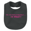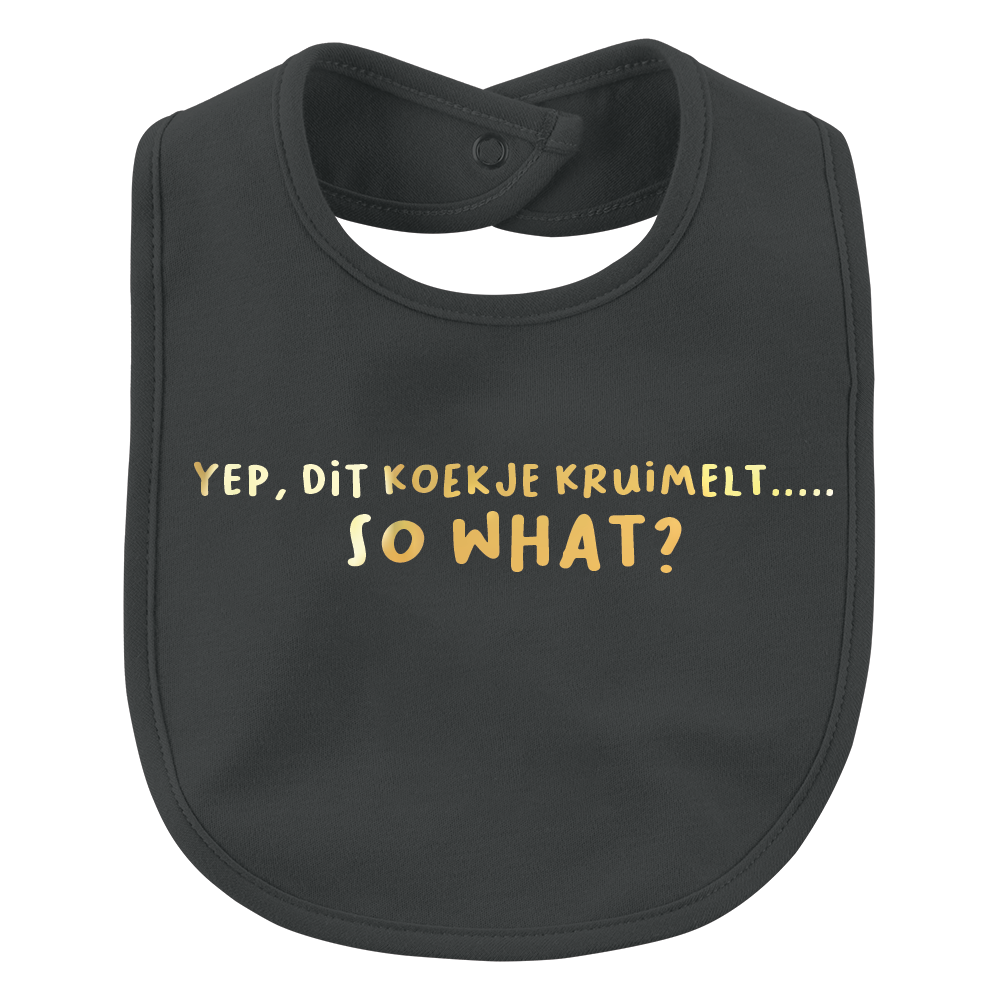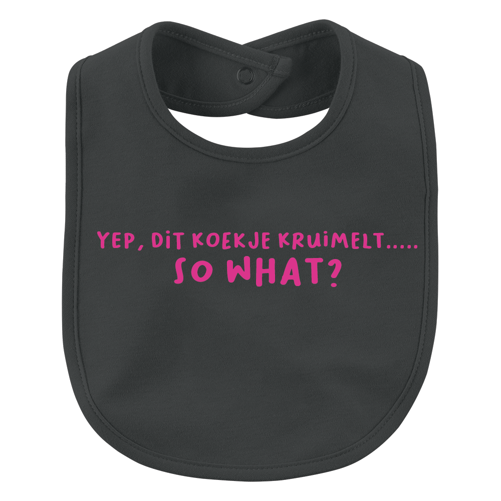 Dit geweldige slabbetje met de tekst’ Yep, dit koekje kruimelt…..So what?’ is een echte aanrader! De bedrukte slabbetjes hebben een standaard maatje (25cm x 20 cm) en zijn verkrijgbaar in de zwarte en witte kleur. Ze worden bedrukt met zwart, witte, neon pink en gouden kleurtjes.