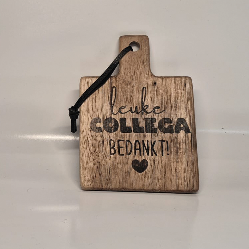 Ben je op zoek naar een leuk cadeau om je collega op een lieve manier bedankt te zeggen? Deze plankjes zijn erg leuk om te geven als je collega je gaat verlaten of gewoon omdat je ze graag wilt bedanken! De plankjes hebben de tekst ‘Bedankt lieve collega’ en zijn gebrand in het hout met als afwerking een vernislaag voor bescherming. De plankjes hebben een afmeting van 12 cm hoog en 9,5 cm breed.
